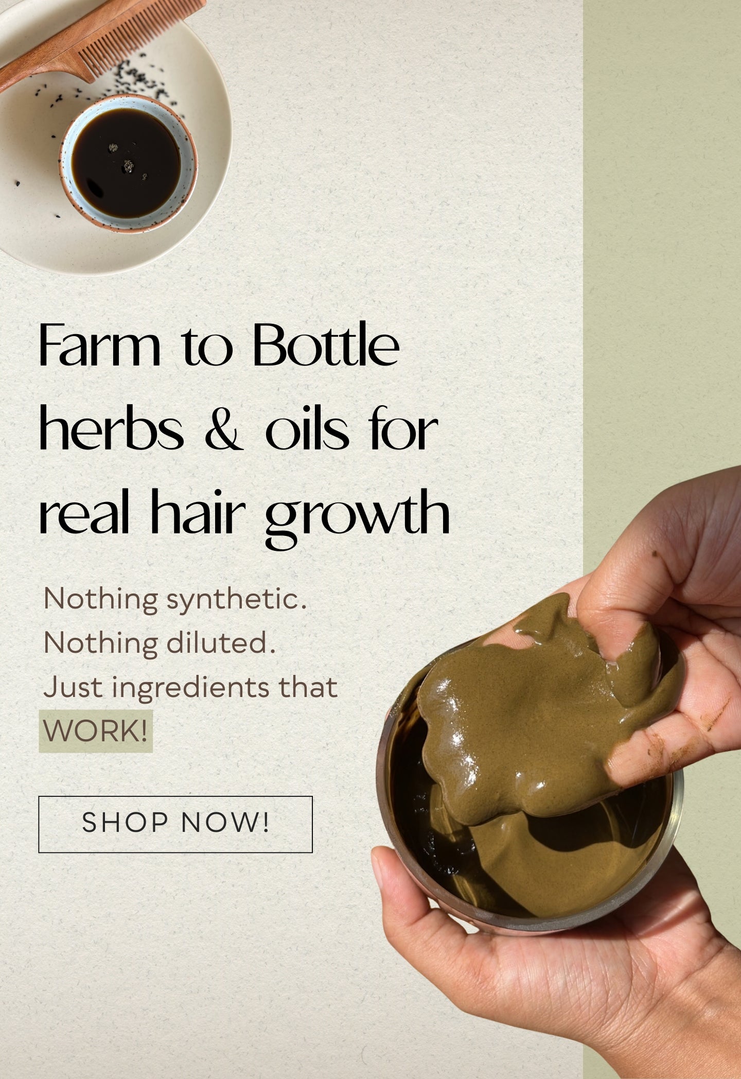 Mix equal parts of our Aloe Vera Gel with Extra Virgin Avocado Oil until it forms a paste. Apply it all over your scalp and hair strands. Shampoo in an hour.